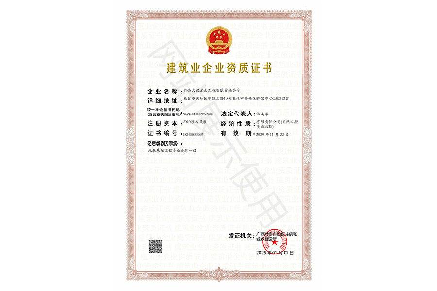 公司董事长具有岩土工程从业经历20年以上,国家注册岩土工程师,建筑/矿业建造师,中国工程建设标准专家库专家,参与主编/参编多项中华人民共和国国家标准规范。在公司董事长的带领下,公司及公司主要负责人本着“专注岩土,铸就品质”的品牌观,以“质量至上,安全第一”为运营观,完成多项诸如华润集团、华邦建设、中节能铁汉建设、五矿集团、广西建工集团、中联世纪建设集团、中铁建桂旅等集团公司委托的工程项目任务,同时参与省内各地市政府主管部门及投资公司、各大国家级园区、院校建设项目工程,并建立了长期的互信互利的战略合作采购伙伴关系,获得了主管部门及业主良好的口碑。